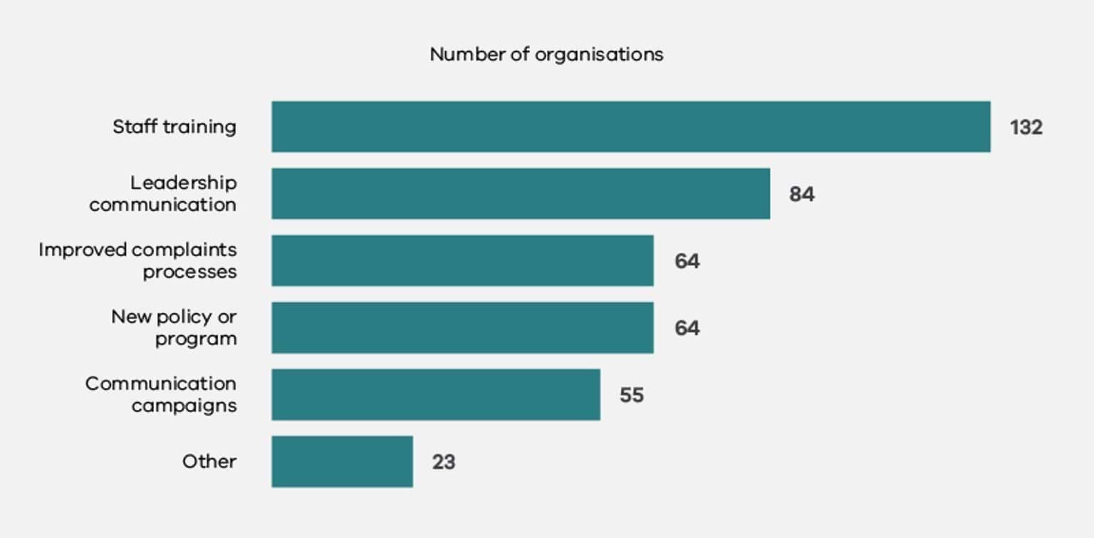 Organisations also had the opportunity to report on the actions they took to prevent future incidents of sexual harassment in the workplace. The Commission received this data from 158 organisations. The most common action was staff training, which was implemented by more than 80% of participating organisations.