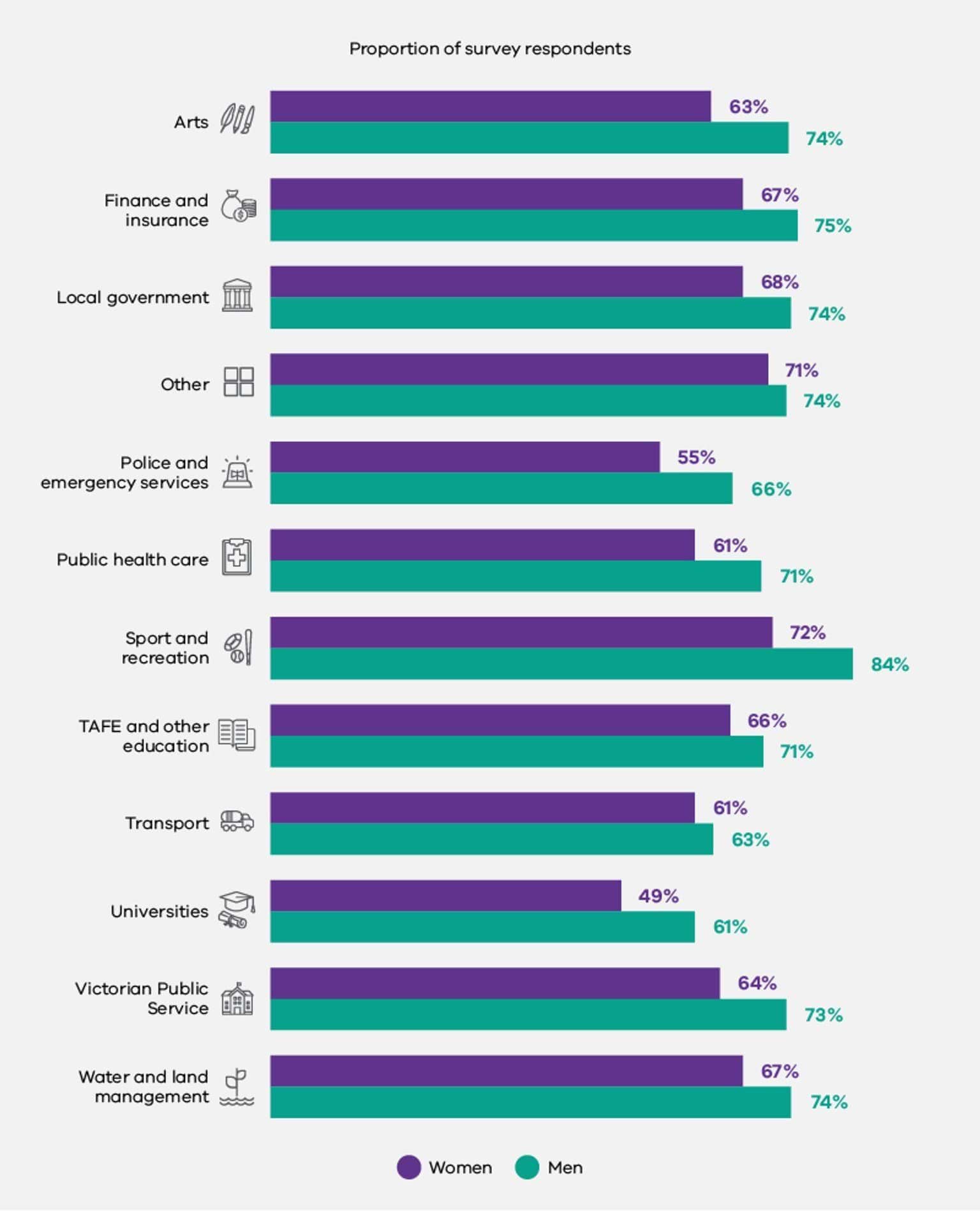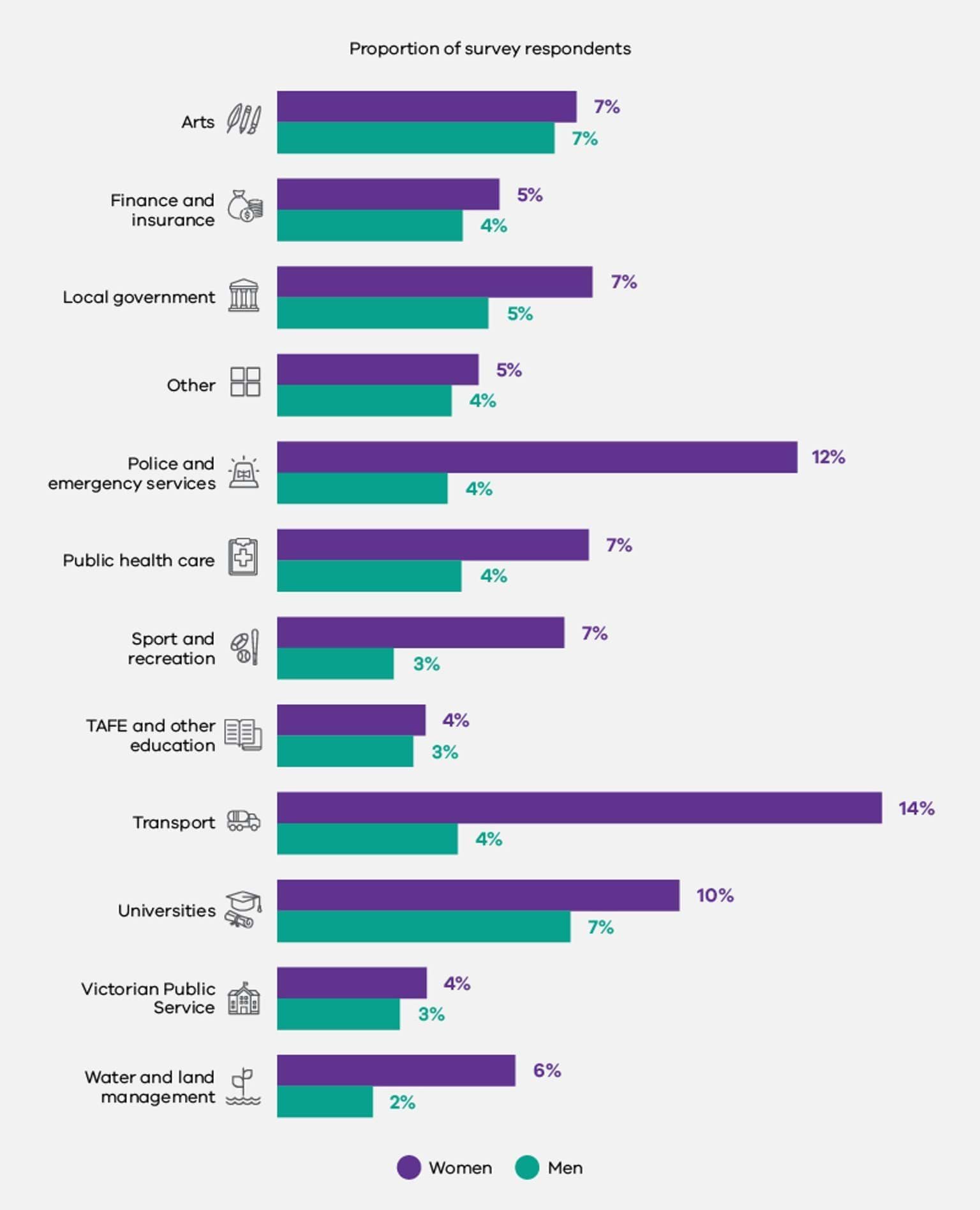 The overall prevalence of workplace sexual harassment across defined entities (6% of women and 4% of men) was comparatively low. Australia-wide research conducted by the AHRC in 2018 showed that in the previous 12 months, 23% of women and 16% of men had experienced sexual harassment at work.134 The prevalence of sexual harassment across defined entities was also significantly lower than findings in particular Victorian workforces and industries. For example, in the Legal industry in 2019, 27% of women and 18% of men said they had experienced sexual harassment in the past 12 months.135 Similarly, in the Local Government industry group in 2020, a survey found that 30% of women and 25% of men had experienced workplace sexual harassment in the previous 12 months.136