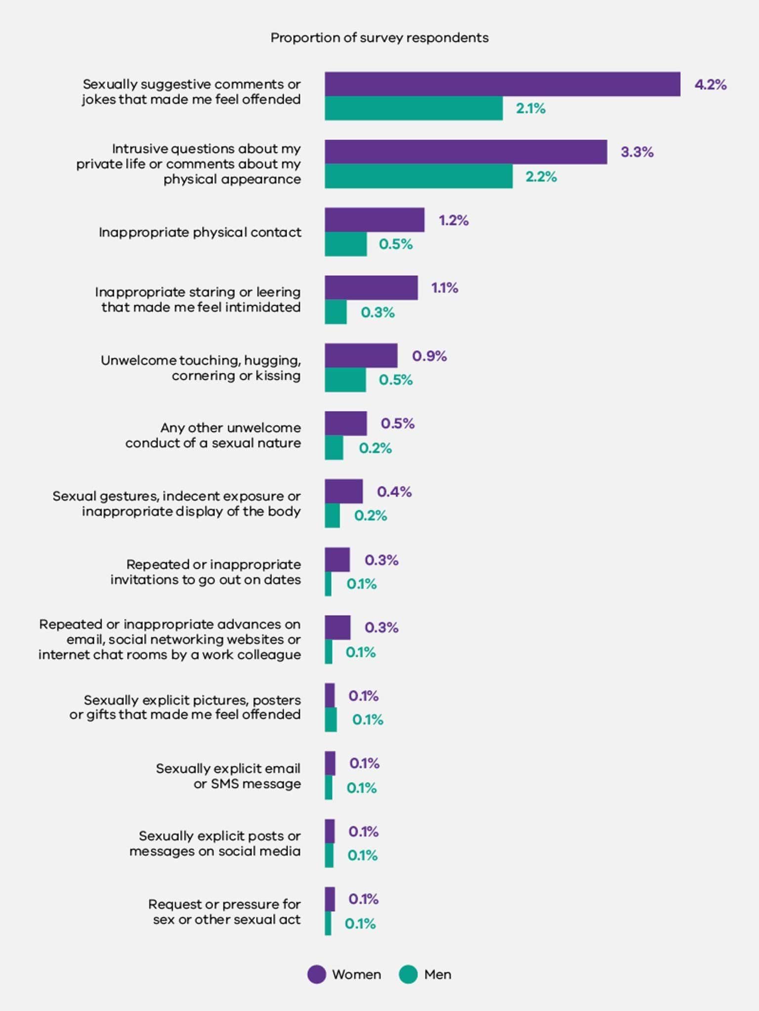 As can be seen in Figure 3.2 below, and in line with findings from other research132, the most common sexual harassment behaviours reported by both women and men were sexually suggestive comments or jokes and intrusive questions about the survey respondent’s private life or comments about their physical appearance. Women were more likely to have experienced most types of sexual harassment behaviours than men.