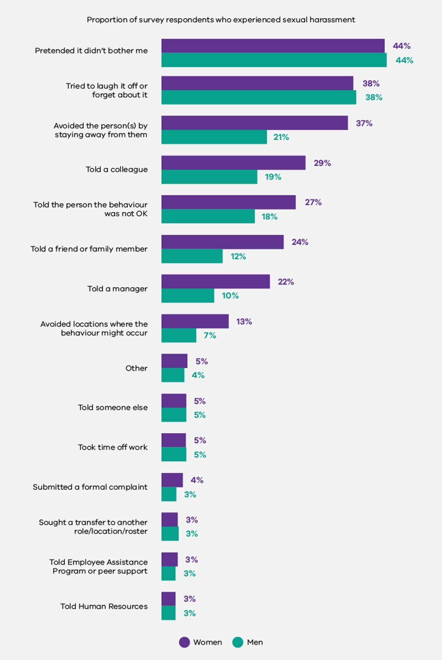 Survey respondents who indicated that they had experienced workplace sexual harassment in the previous 12 months were asked how they had responded. As Figure 3.3 below shows, the most common responses to sexual harassment for both men and women were to pretend the behaviour didn’t bother them, to try to laugh it off, or to try to forget about it. More women than men said they responded by avoiding the person, by telling a colleague, by telling the person the behaviour was not okay, by telling a friend or family member, by telling a manager, or by avoiding locations where the behaviour might occur.