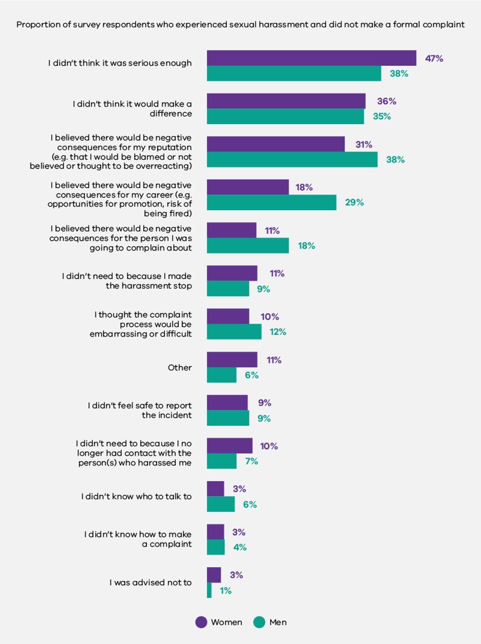 As seen in Figure 3.5 below, among those survey respondents who did not make a formal complaint after experiencing sexual harassment, 47% of women and 38% of men said they didn’t think the harassment was serious enough. For women, the next most common reason was that they didn’t think it would make a difference (36%). For men, the next most common reason was that they believed there would be negative consequences for their own reputation (38%). Further, 29% of men and 18% of women said they did not report their experience of sexual harassment because they believed this would have negative consequences for their career.