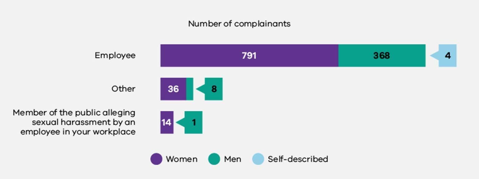 Of the remaining 91 organisations with formal sexual harassment complaints data, 88 provided detail around the complainant’s relationship to the organisation. Within this dataset, the vast majority of formal sexual harassment complaints were lodged by employees – about 70% of whom were women.